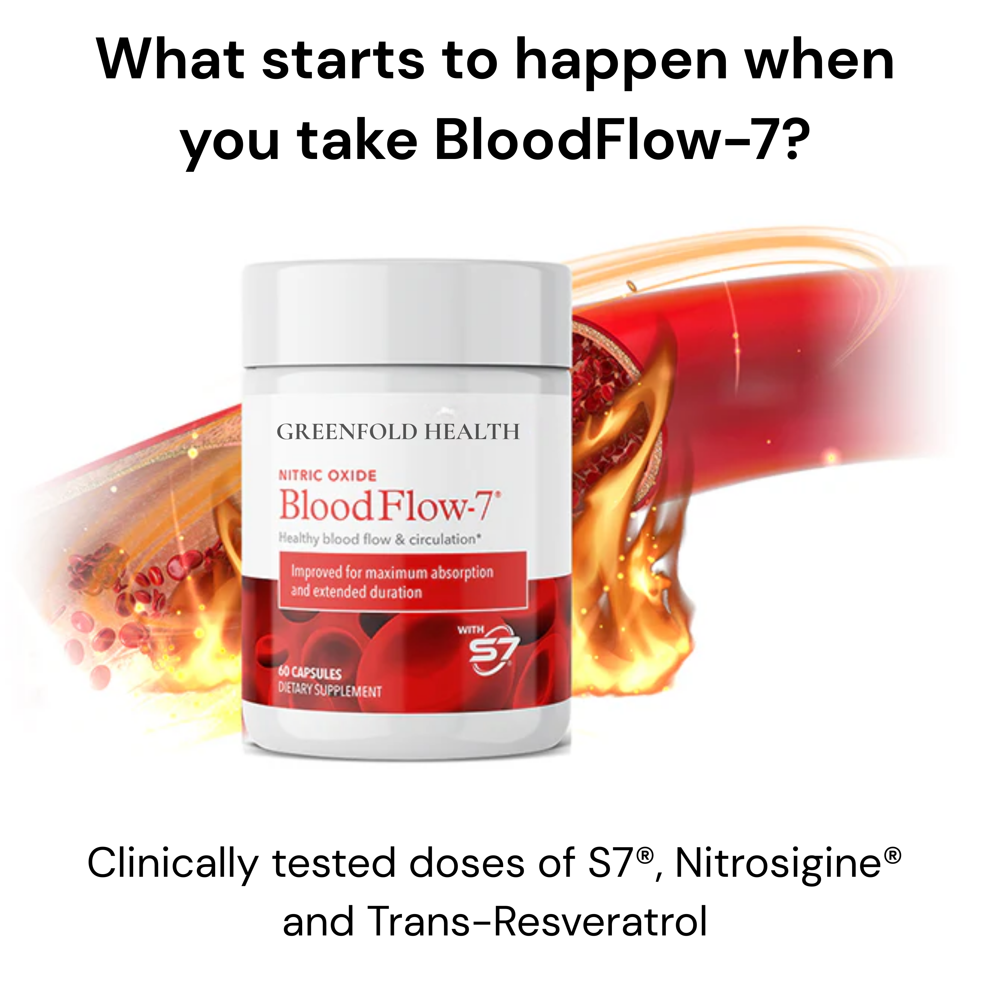 GreenFold Health's BloodFlow-7® formula contains natural, safe, and clinically researched ingredients that can boost your nitric oxide levels by 230% to improve blood circulation and help maintain healthy blood pressure. Studies have shown that nitric oxide supplements can help maintain healthy pressure. The FDA has not evaluated these statements. This product is not intended to treat, cure, or prevent diseases.
